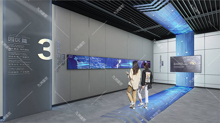 城市:山東青島,時間:2018年3月-5月。設(shè)計理念:園區(qū)科技展廳布局大氣,黑白色為主調(diào),藍(lán)色點綴,聲光電演繹園區(qū)的輝煌未來