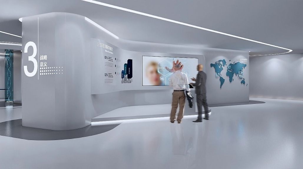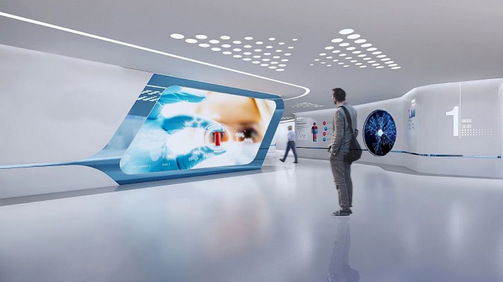 城市:山東菏澤,時間:2020年6月-9月。設計理念:展廳布局簡潔,白色為主,藍色點綴,聲光電演繹生命奧秘,展示企業細胞生命科技實力。