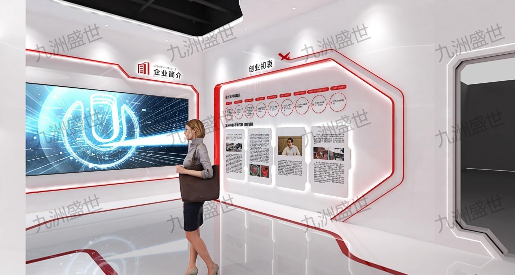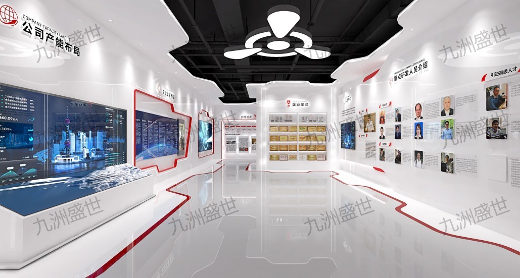 設計思路:以白色為主色調,搭配紅色點綴,體現企業穩重、專業的形象,展示機械行業的科技感與未來感。結合企業歷史、發展成就及核心價值觀,打造互動體驗區,展現企業文化內涵與團隊風采,提升員工及訪客的文化認同感與歸屬感。