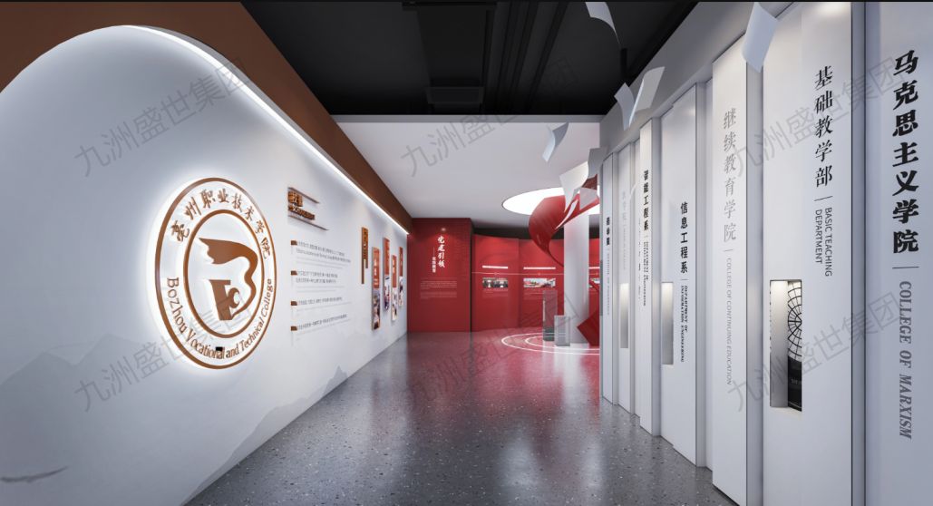 設計思路:以現代科技為引領,打造充滿未來感的展示空間。運用數字化、互動化等先進手段,生動呈現學校的發展歷程、教學成果與創新實踐。整體設計簡潔大氣,突顯科技魅力,讓參觀者深刻感受學院的現代化與前瞻性。